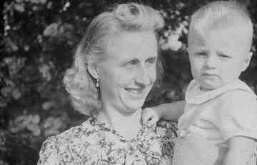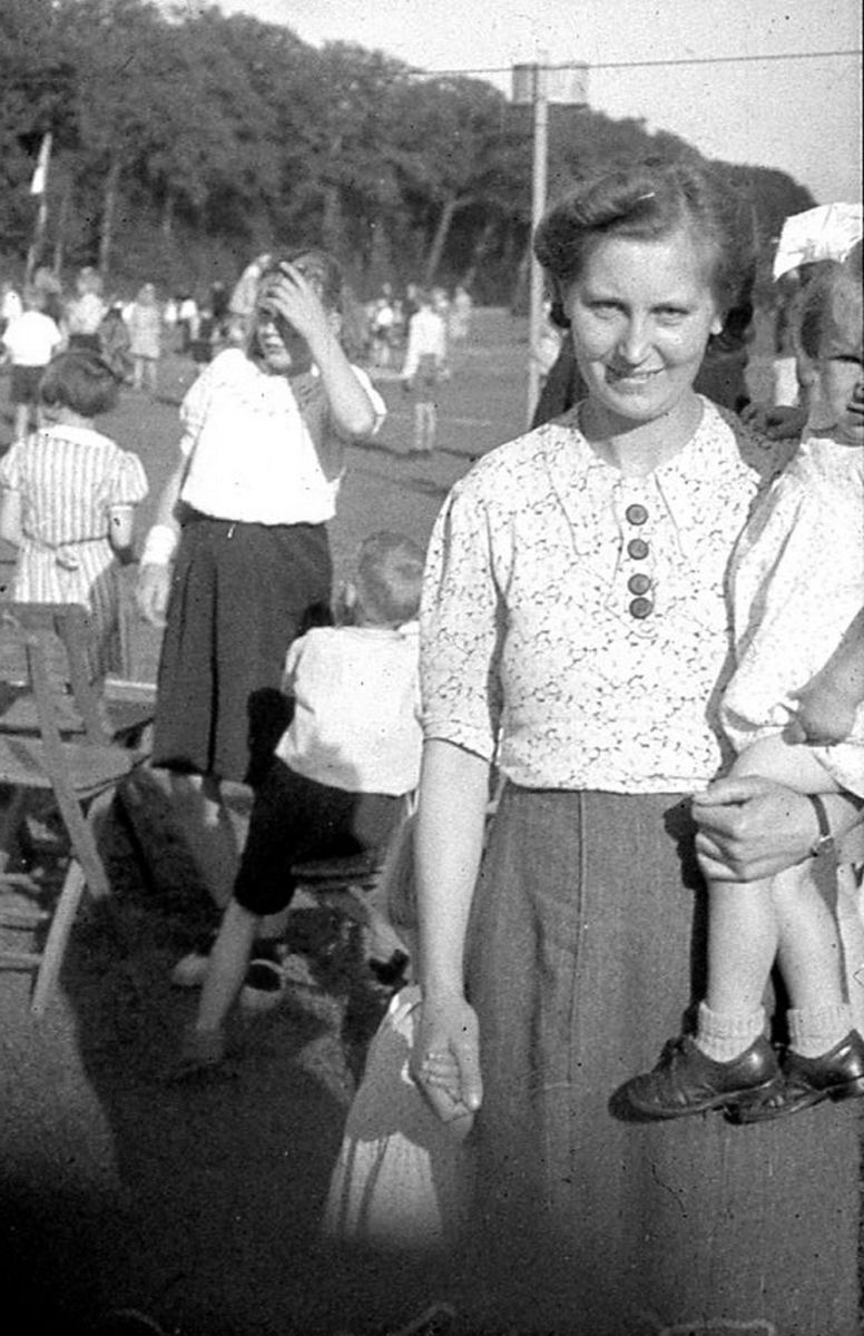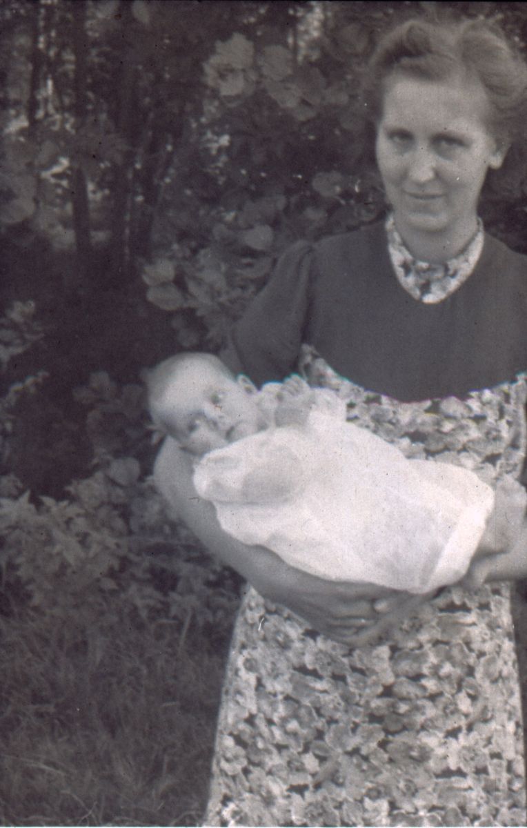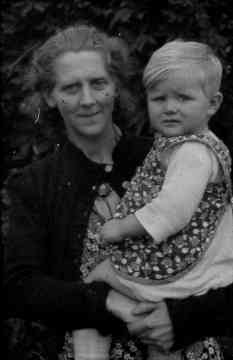 Gytsjerk. Baukje Hoekstra de Jong met Gosse op de arm. Eind 1940-er jaren. Foto Haakma